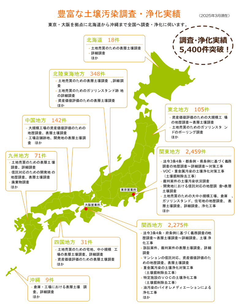当社の土壌汚染調査・浄化の実績は、2025年3月現在で、北海道で18件、東北地方(青森、岩手、秋田、宮城、山形、福島)で105件、関東地方(群馬、栃木、埼玉県、茨城、千葉、東京、神奈川)で 2,459件、北陸東海地方(新潟、長野、富山、石川、山梨、静岡、愛知、岐阜、福井、三重)で348件、関西地方(兵庫、京都、滋賀、大阪、奈良、和歌山)で 2,275件、中国地方(鳥取、岡山、島根、広島、山口)で142件、四国地方(愛媛、高知、徳島、香川)で31件、九州地方(福岡、佐賀、長崎、大分、熊本、宮崎、鹿児島)で71件、沖縄で9件。トータルで5,458件を実施させていただきました。有難うございます。